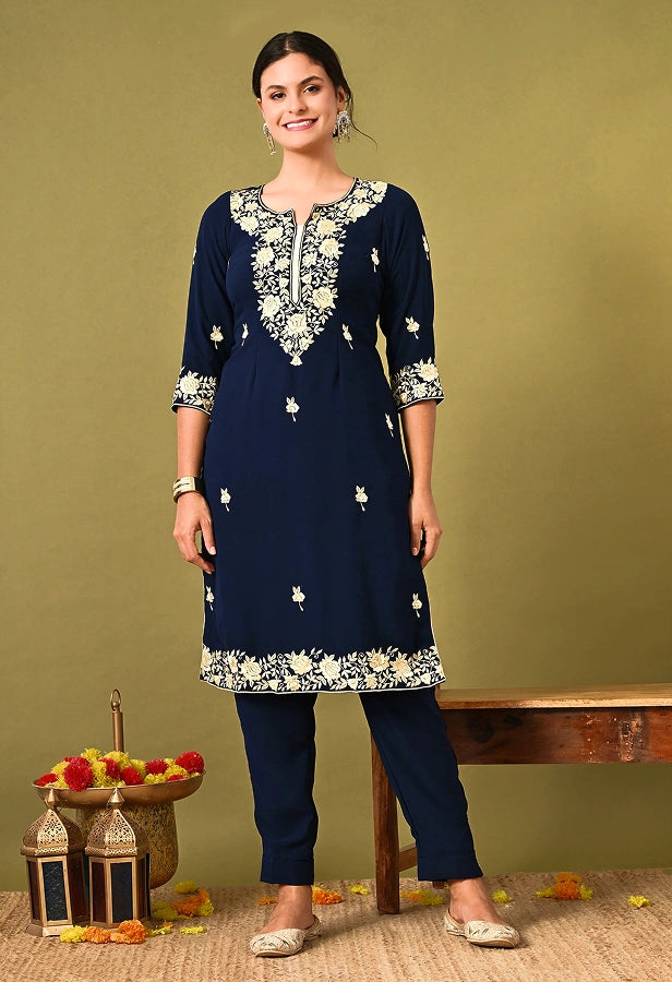 Blue Crepe Silk & Organza Zardozi–Sequin–Pearl Sharara Set