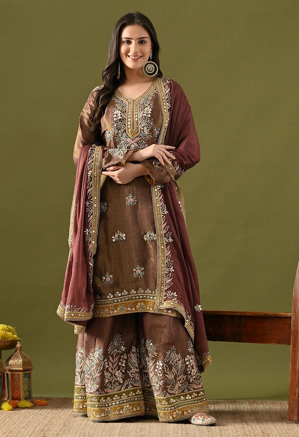 Purplish Brown Tissue Silk & Organza Gotta–Mirror–Zardozi–Applique Sharara Set