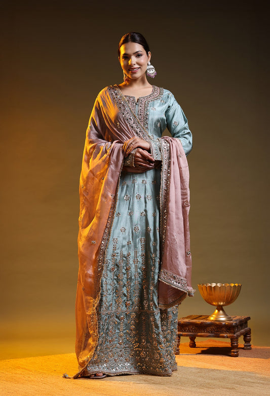 Blue Silk & Organza Thread–Zardozi–Dabka–Sequin Anarkali Set