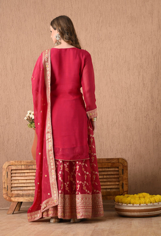 Exquisite Dark Pink Lehnga Set with Banarsi Weaving and Zardozi Work