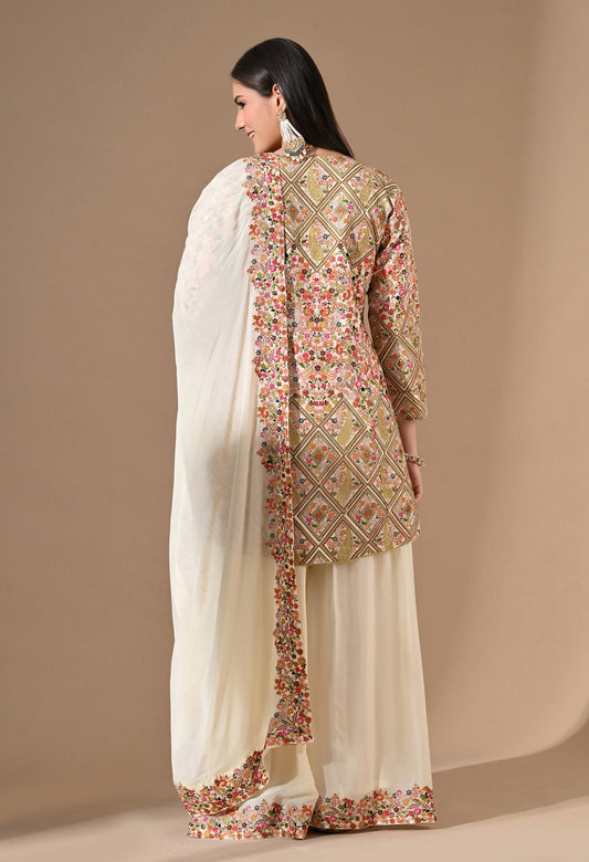Cream Chinon Sharara Set with Pearl & Zardozi Work