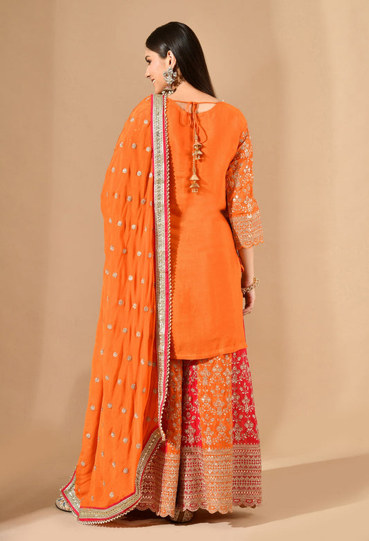 Orange & Pink Chinon Sharara Set with Zardozi & Mirror Work