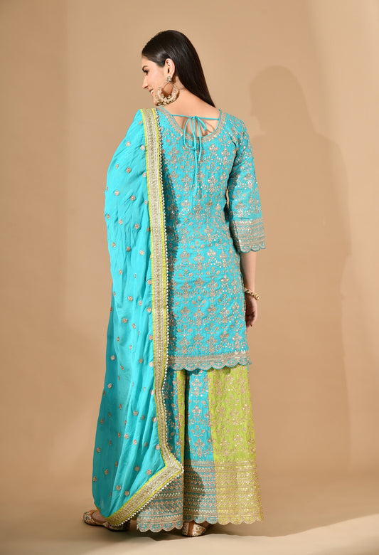 Aqua Blue Sharara Set with Thread, Zardozi, Mirror & Sequin Work.