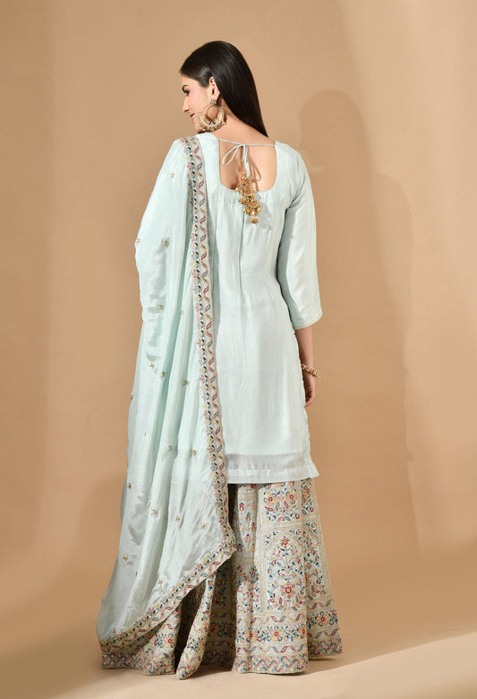 Aqua Blue Sharara Set with Zardozi, Applique, Pearl & Sequin Work.