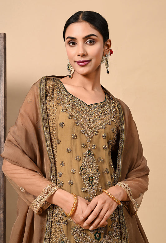 Greenish Brown Hue Kurta Set with Zardozi, Cutdana, and Pearl Work