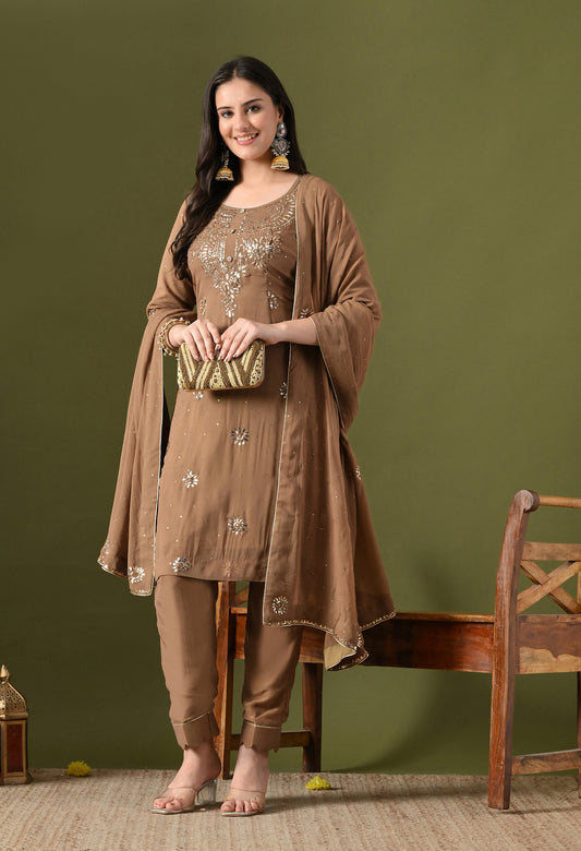 Mehndi Brown Georgette & Crepe Mukaish Kurta Set