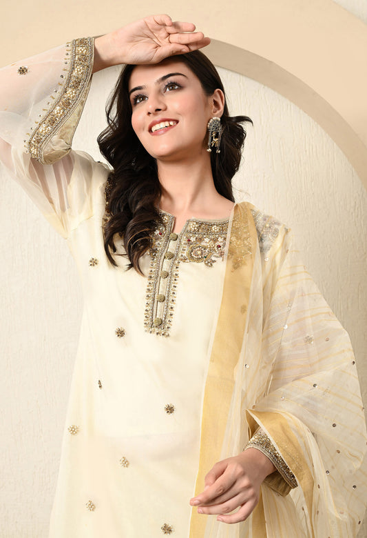 Cream Kurta Set with Zardozi, Crystal, Sequence and Pearl Work
