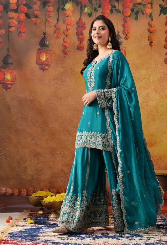 Dark Bluish Green Chinon Sharara Set with intricate zardozi, dabka, crystal, and mirror work, paired with a matching dupatta