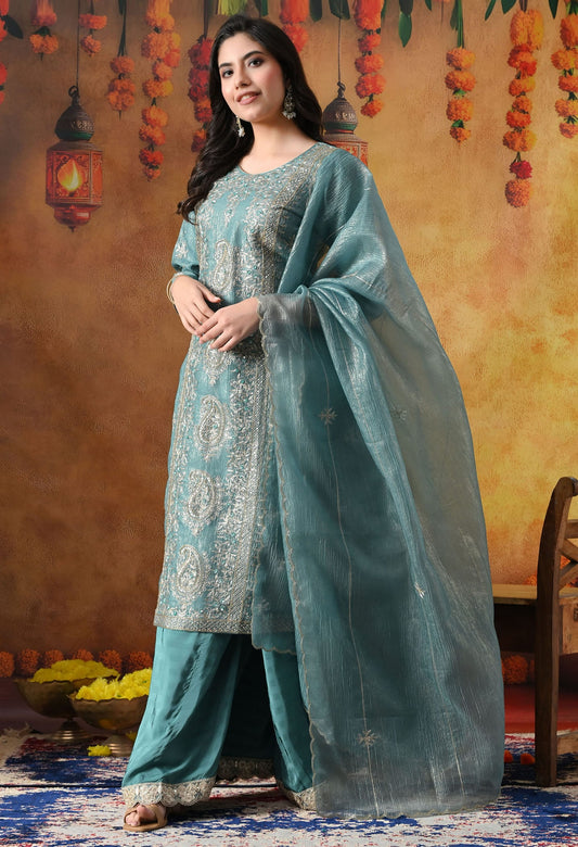 Turquoisesh Blue Sharara Set in crust tissue organza with intricate zardozi, dabka, sequin, and pearl work, paired with a crepe sharara