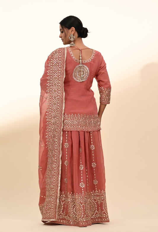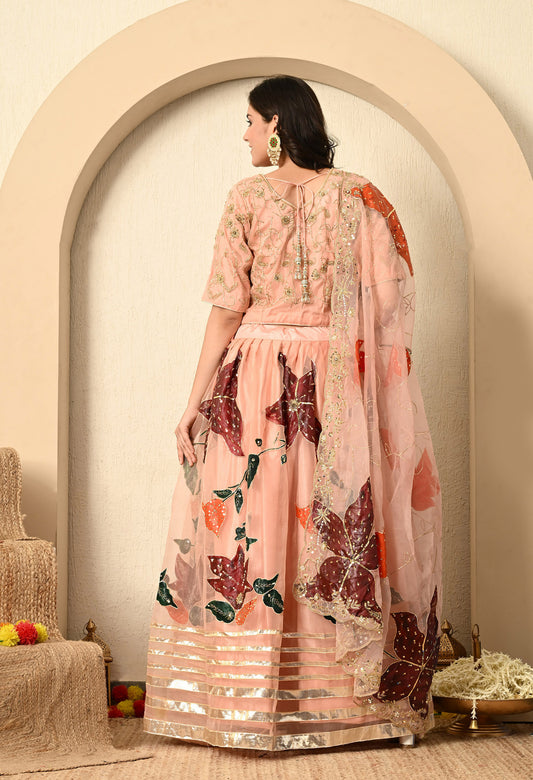 Dark Peach Lehenga Set with Hand Paint, Gotta, Zardozi, and Sequence Work