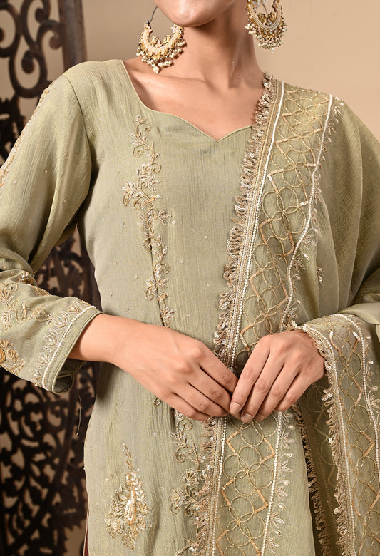 Green Silk Gharara Set with Zardozi & Cutdana Embroidery
