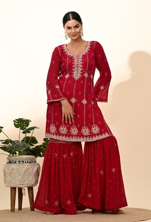 Rich Maroon Crepe Sharara Set with Thread and Sequin Embroidery
