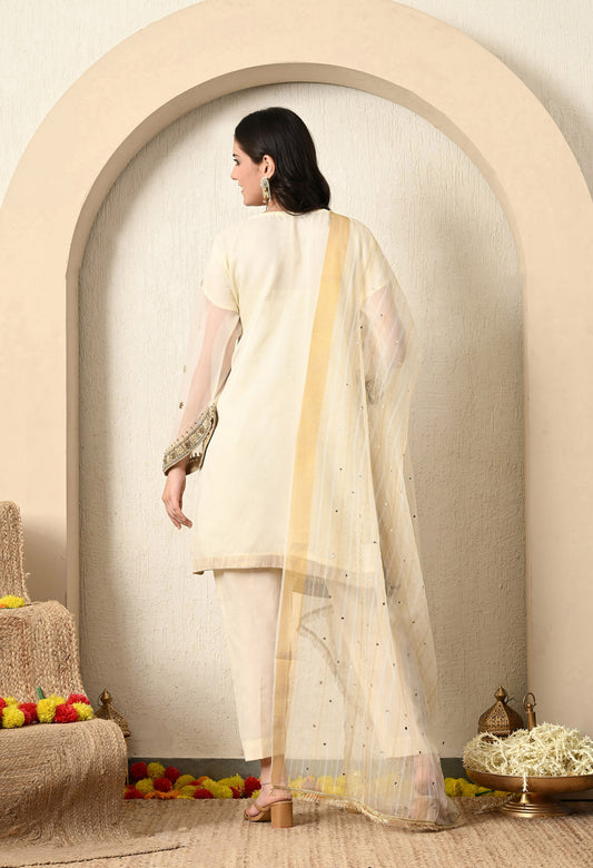 Cream Kurta Set with Zardozi, Crystal, Sequence and Pearl Work