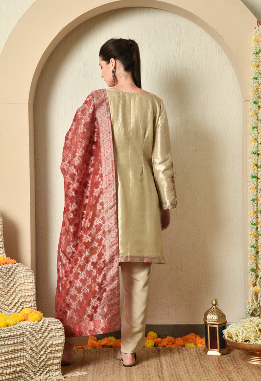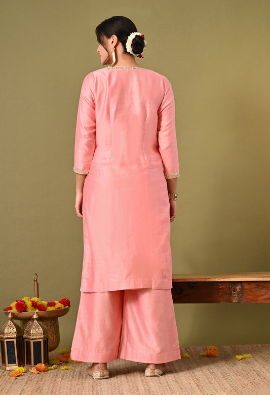 Exquisite Peach Pink Silk Kurta Set, Embellished with Zardozi and Gota Patti Embroidery