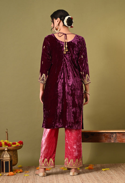 Elegant Pink Wine Velvet Kurta Set with Zardozi, Gota Patti, and Pearl Embroidery