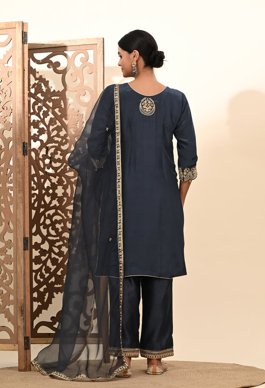 Chic Charcoal Grey Silk Kurta Set with Intricate Zardozi Details
