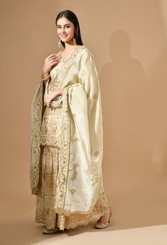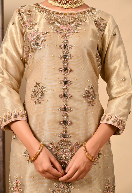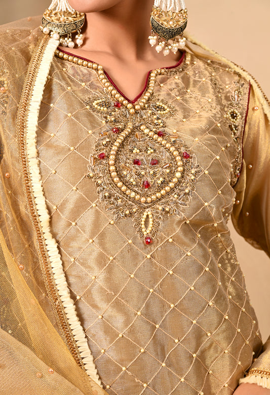 Golden Crushed Tissue Kurta Set with Zardozi & Sequin Work