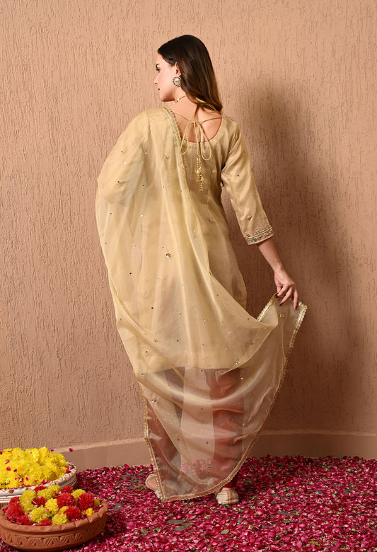 Golden Kurta Set with Zardozi, Dabka, Pearl, and Organza Applique Work