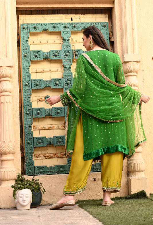 Beauitful Green Kurta Set with Gota Patti, Zardozi, Dabka, Mirror, and Applique Work
