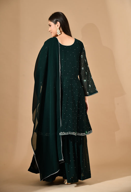 Bottle Green Georgette Gharara Set with Crystal & Thread Work