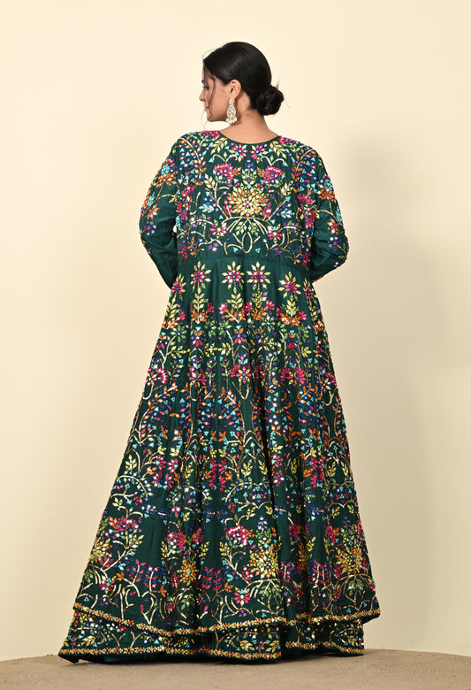 Bottle Green Anarkali with Zardozi, Sippy, Sequin, and Mirror Work