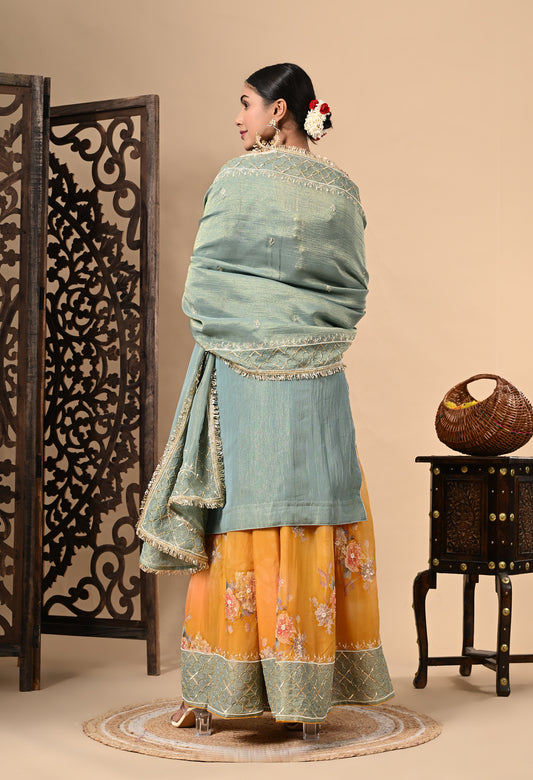 Greenish Grey Tissue Silk & Organza Gotta–Applique–Mirror–Zardozi Sharara Set