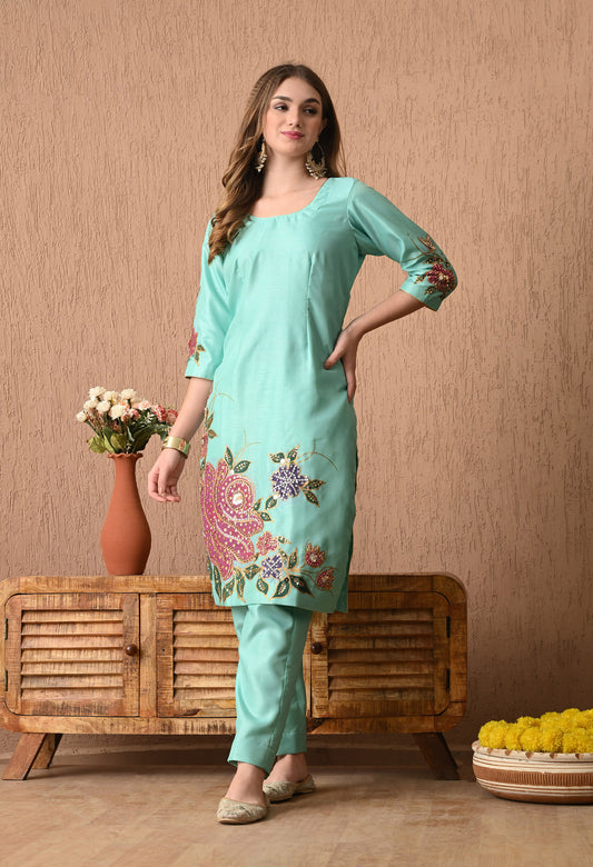 Turquoise Green Silk Kurta Set with Intricate Embroidery and Hand-Painted Detailing