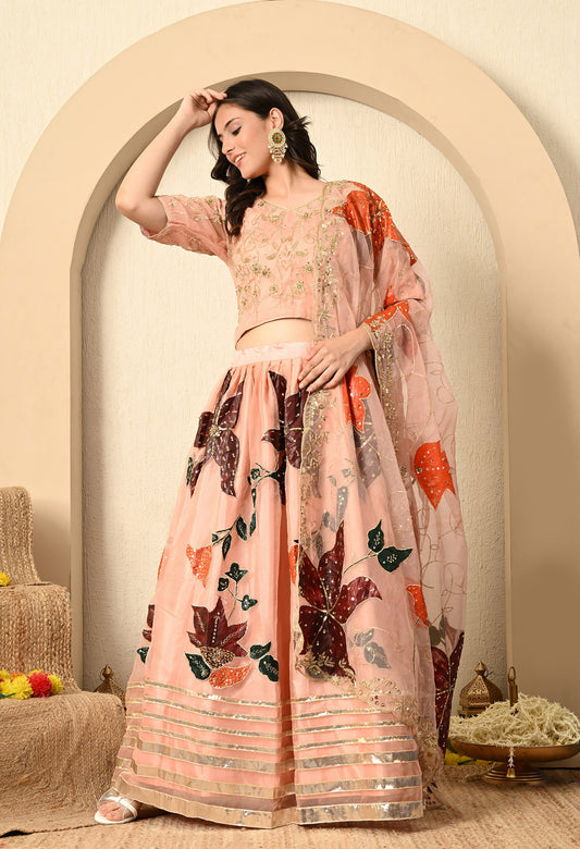 Dark Peach Lehenga Set with Hand Paint, Gotta, Zardozi, and Sequence Work