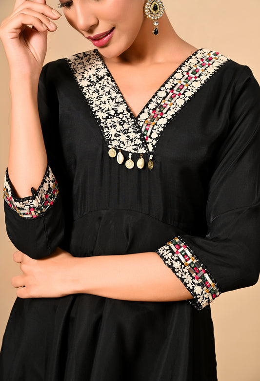 Stylish Black Co-Ord Set with Thread Work on Umbrella Flared Top & Bottom