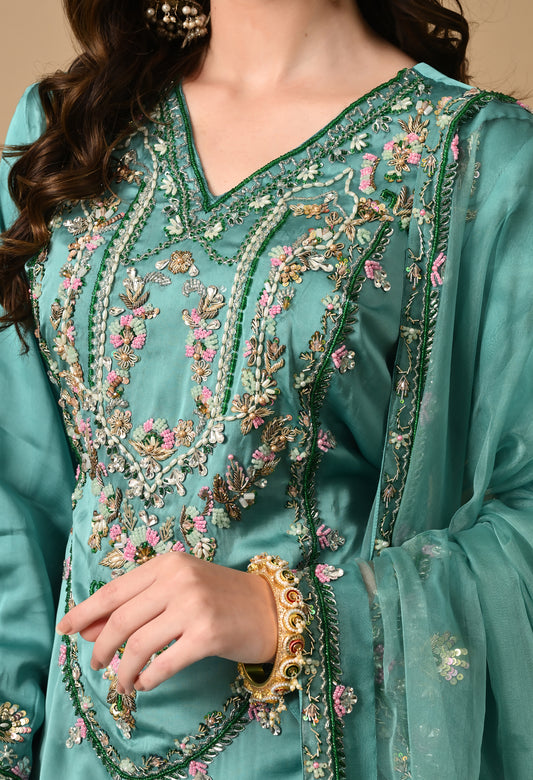 Green Satin Silk Kurta Set with Zardozi and Pearls