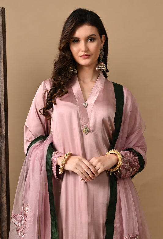 Pink Silk Kurta Set with Pearl and Thread Embroidery