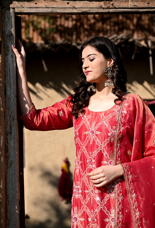 Reddish Pink Kurta Set with Beautiful Thread Work