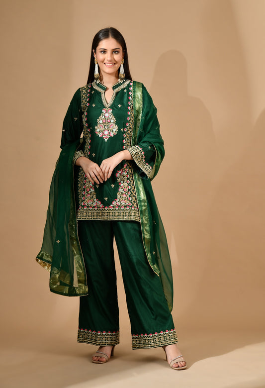 Green Silk Kurta Set with Zardozi, Pearl & Cutdana Work
