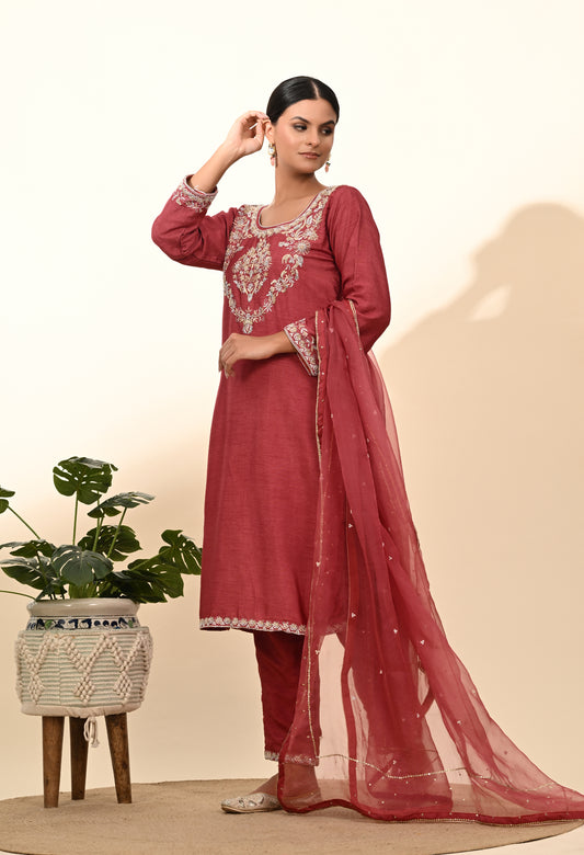 Warm Brown Red Silk Kurta Set with Zardozi Embroidery