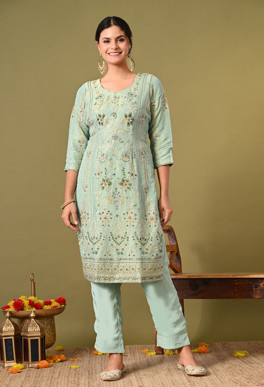 Light Blue-Green Zardozi Sequin Dabka Kurta Ensemble