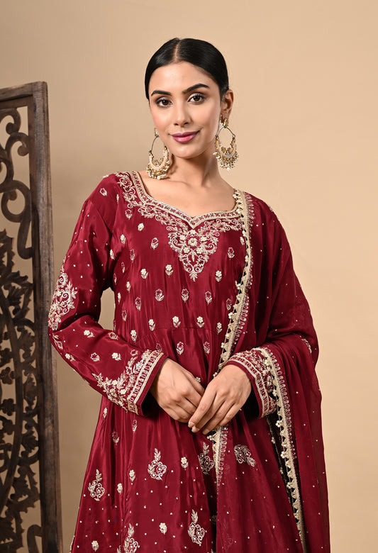 Dark Maroon Anarkali Set with Zardozi, Dabka and Sequin