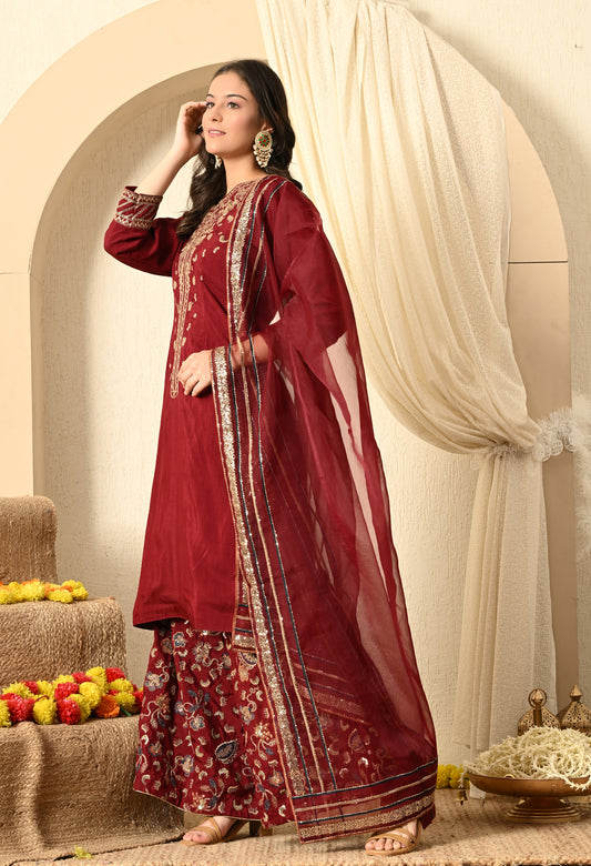 Red Maroon Sharara Set with Thread, Zari, and Sequence Work