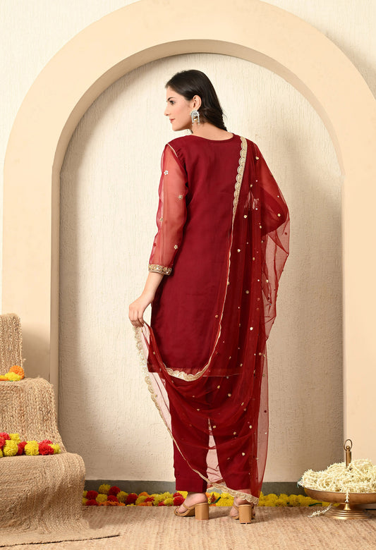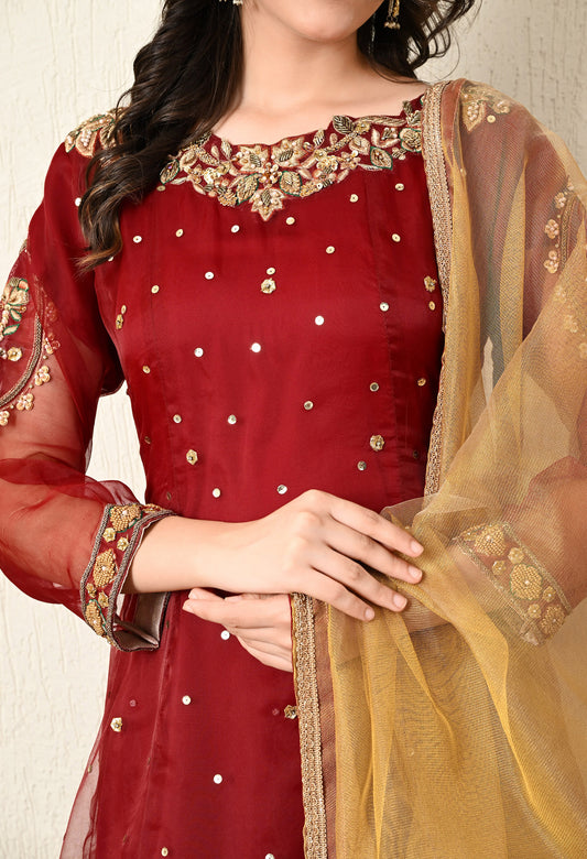 Maroon Red Kurta Set with Zardozi, Dabk, and Stone Work