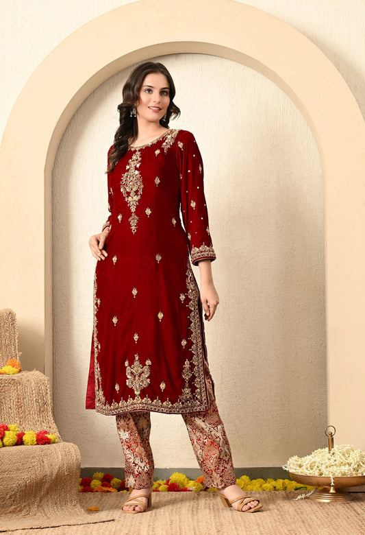 Elegant Maroon Red Kurta Set with Rich Zardozi Embroidery