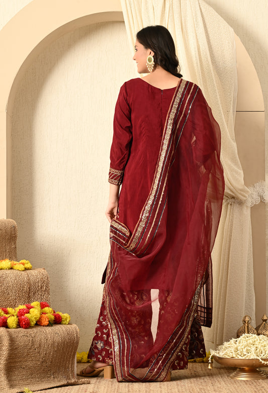 Dark Maroon Kurta Set with Zardozi, Dabka, Sequin, and Thread Work