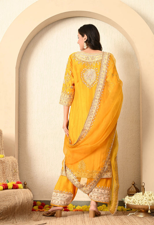 Saffron Yellow Kurta Set with Zardozi, Tilla, and Dabka Work