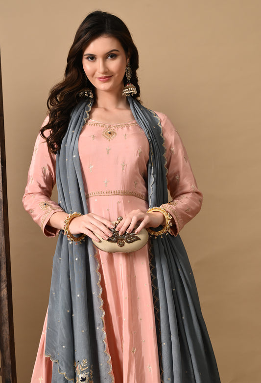 Mesmerising Peach Pink Anarkali Set with Intricate Zardozi Work
