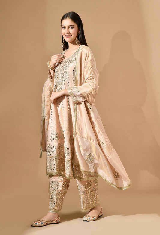 Astonishing Beige Peach Kurta Set with Zardozi and Sequence Work