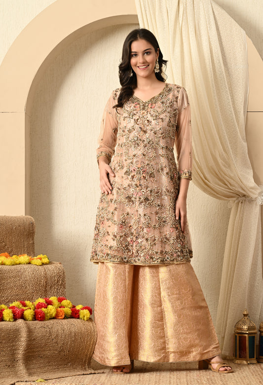 Peach Sharara Set with Zardozi, Thread, Sequence and Cutdana Work