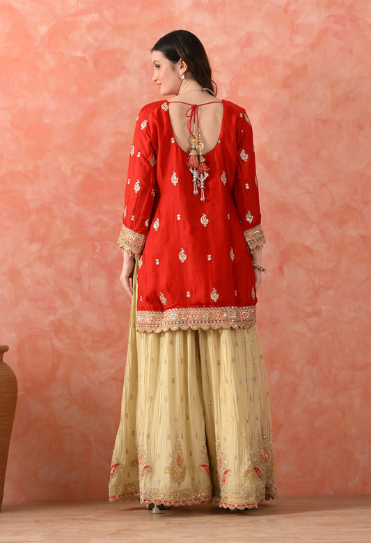 Red Gharara Set with Zardozi, Pearl, Sequin & Cutdana Work