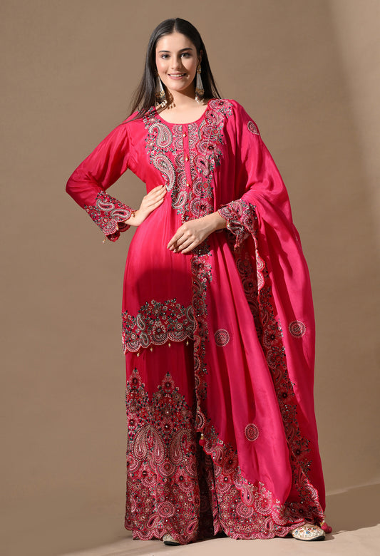 Hot Pink Sharara Set with Mirror & Pearl Work