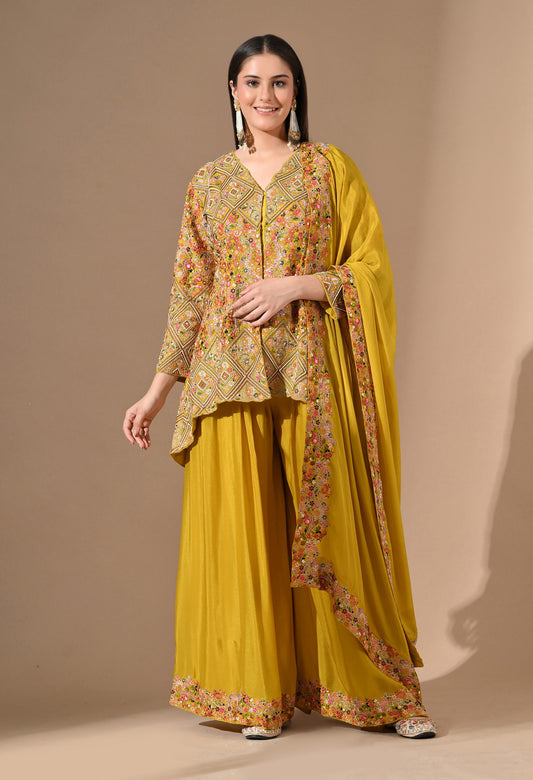 Yellow Chinon Sharara Set with Zardozi & Pearl Work