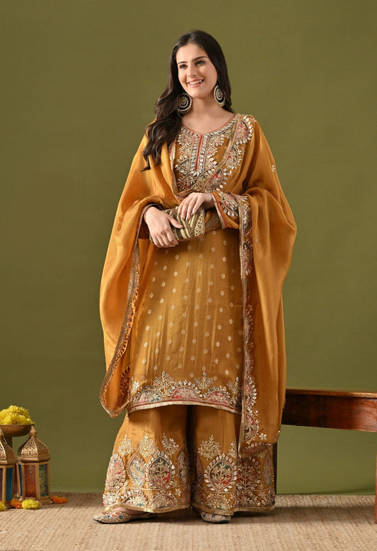 Dark Golden Yellow Tissue Silk Sharara Set with Gotta, Applique & Zardozi Work.