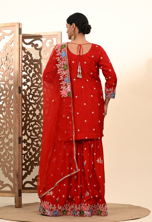 Vibrant Red Silk Gharara Set with Zardozi Embroidery, Thread, and Pearl Work