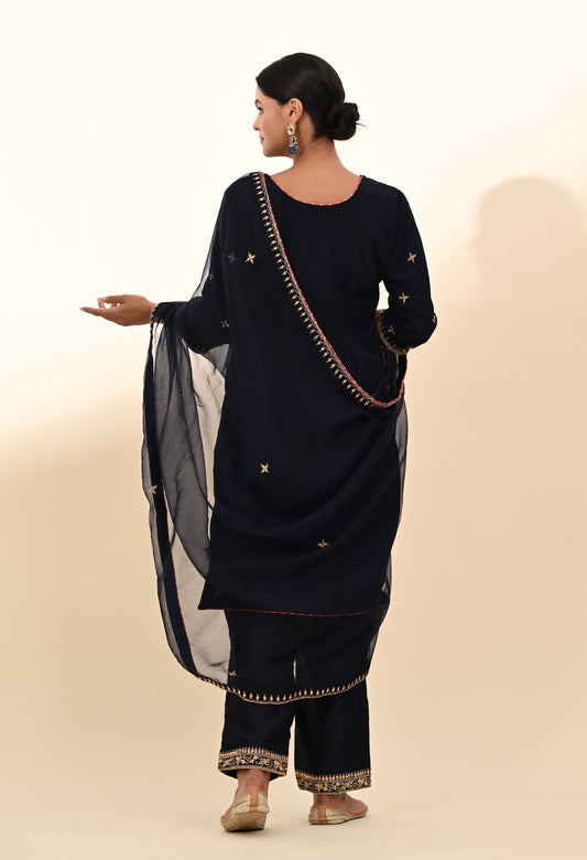 Sophisticated Navy Blue Kurta Set, Embellished with Exquisite Zardozi Embroidery and Crystal Accents